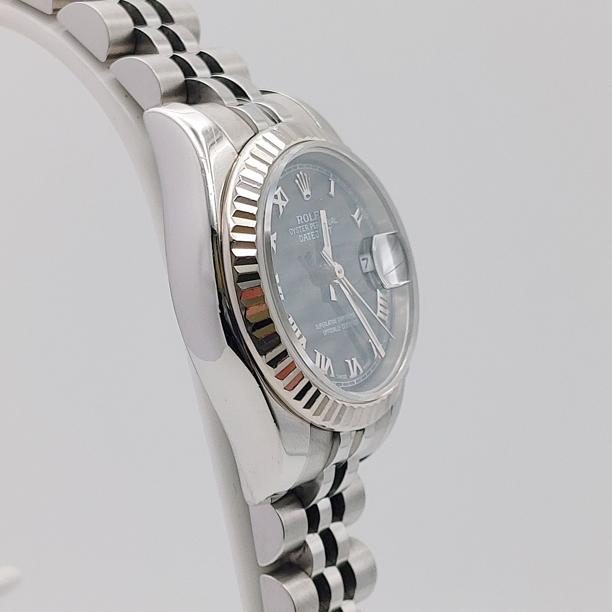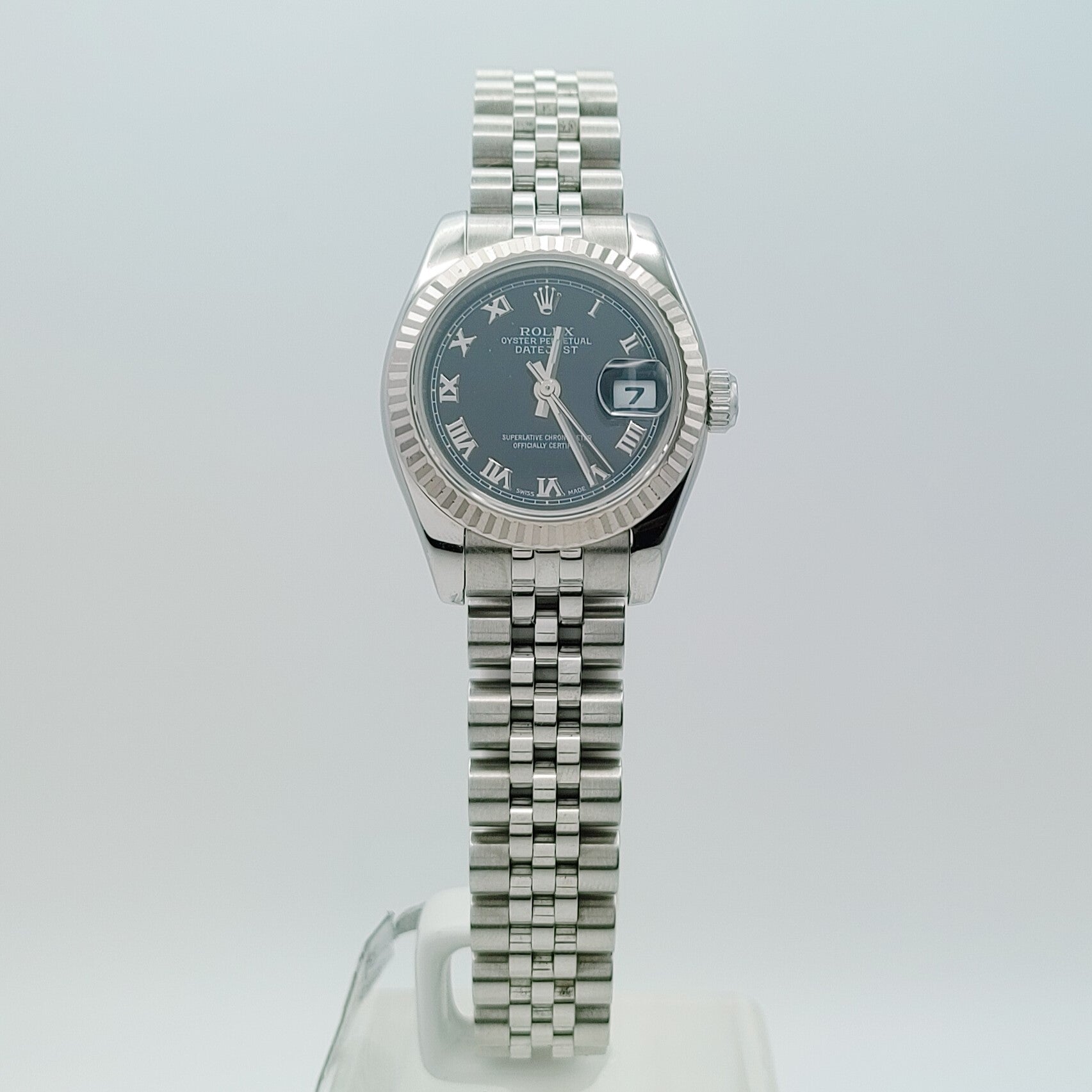 The Rolex 179174 is a refined and elegant timepiece from the Oyster Perpetual Datejust collection. With a 26mm stainless steel case, this model features an 18k white gold bezel. The black dial, Roman numeral hour markers, and a date display at 3 o'clock, magnified by the signature Cyclops lens, make for a functional yet stylish layout.